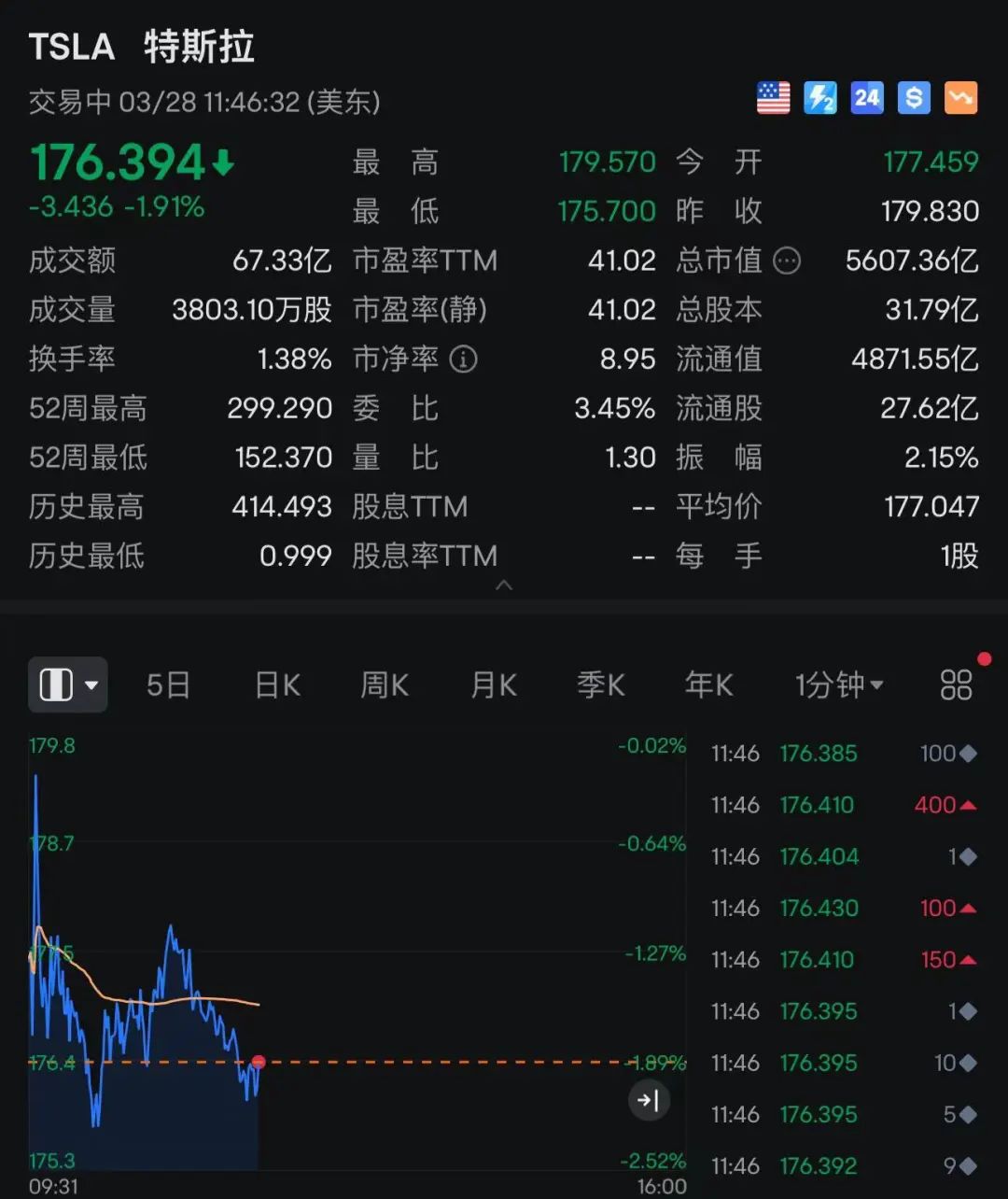另一方面,特斯拉股价下跌1.91%,截至发稿,报176.394美元