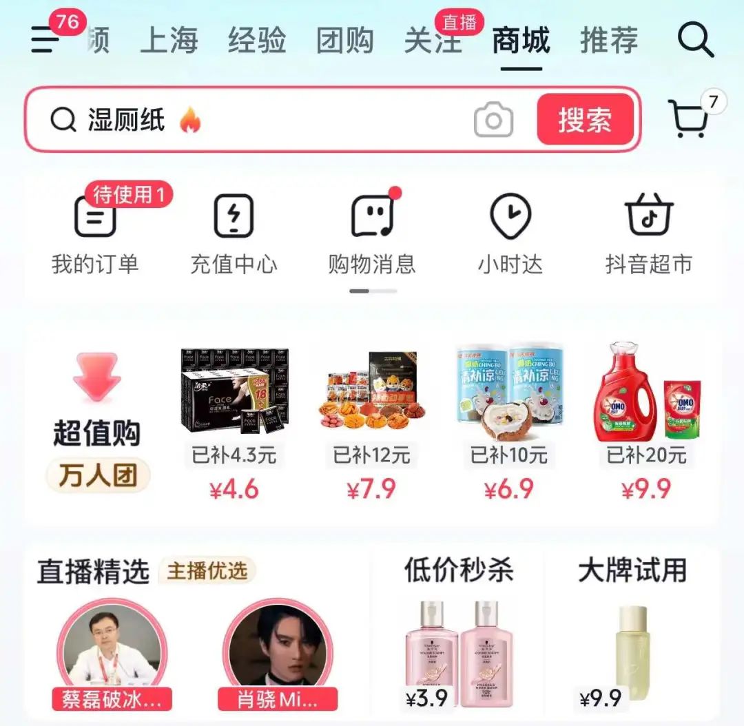 目前,抖音商城首页上半屏中,囊括了多个低价专区入口。