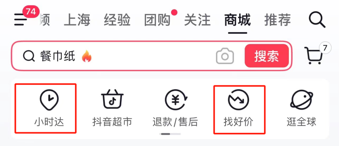 同时,抖音商城页面上线了比价频道“找好价”。通过该功能,用户可在商城内找到同款商品的最低价,入口与抖音电商现阶段重点业务“小时达”并列。